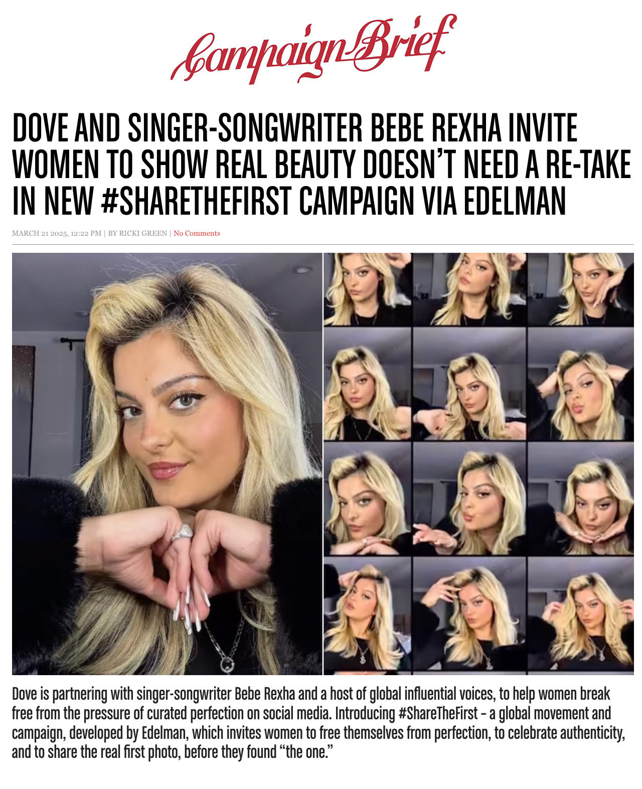 Campaign Brief | Dove and singer-songwriter Bebe Rexha invite women to show real beauty doesn’t need a re-take in new #ShareTheFirst campaign